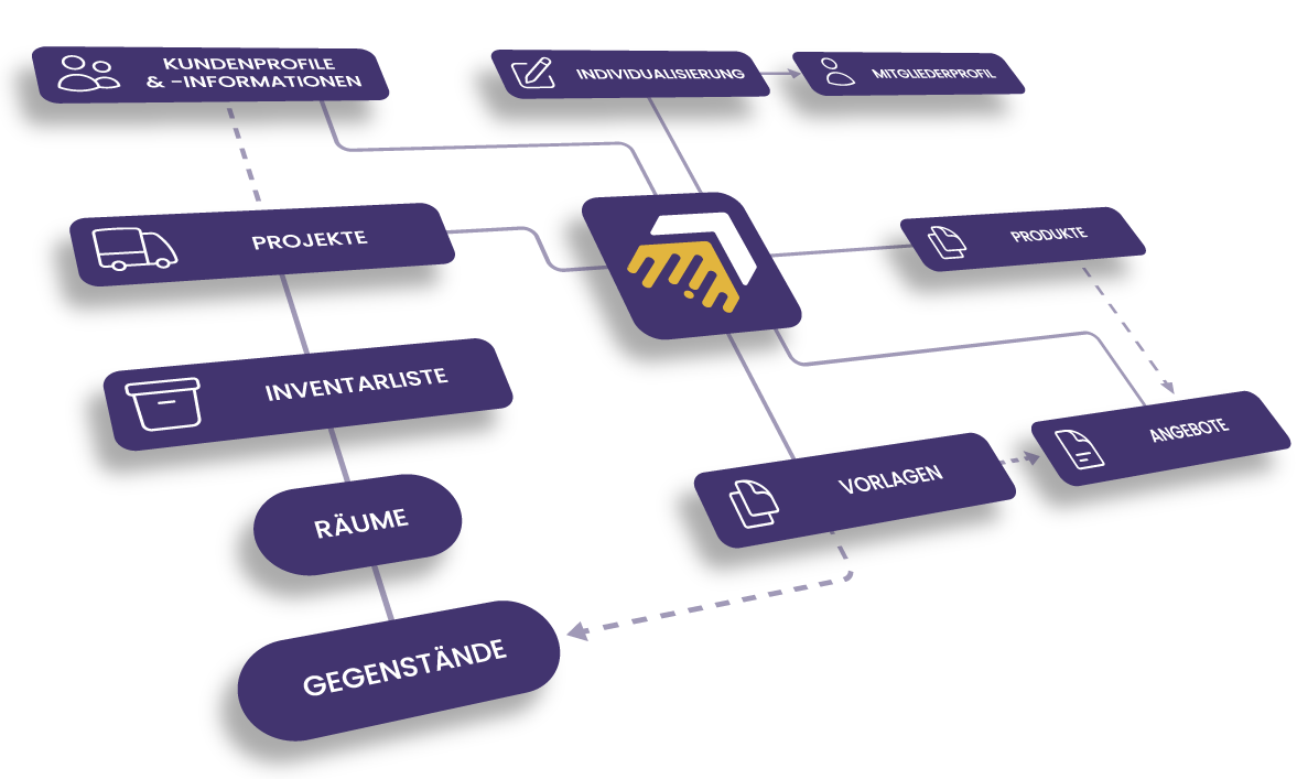 FastMove verbindet alle zentralen Prozesse in einer Plattform. Kundenverwaltung, Inventaraufnahme, Angebote und Planung greifen ineinander und nutzen dieselbe Datenbasis.