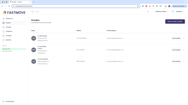 Alle Kundendaten, Anfragen und Umzüge zentral verwalten. Mit FastMove organisieren Sie Ihren Betrieb von der ersten Anfrage bis zum Auftrag.